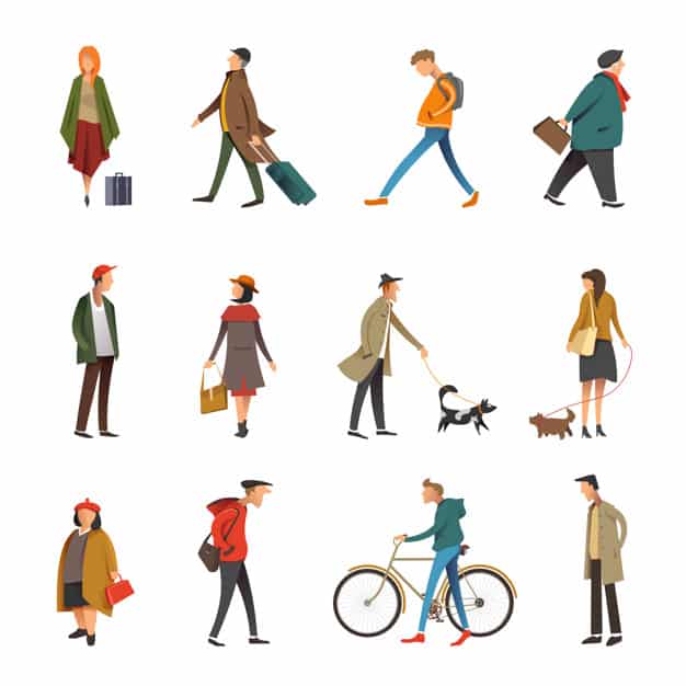 People in daily life outdoor activity icons. Vector flat set of young and adult woman or man walking dog or riding bicycle and holding travel or shopping bag, businessman and boy in casual clothes